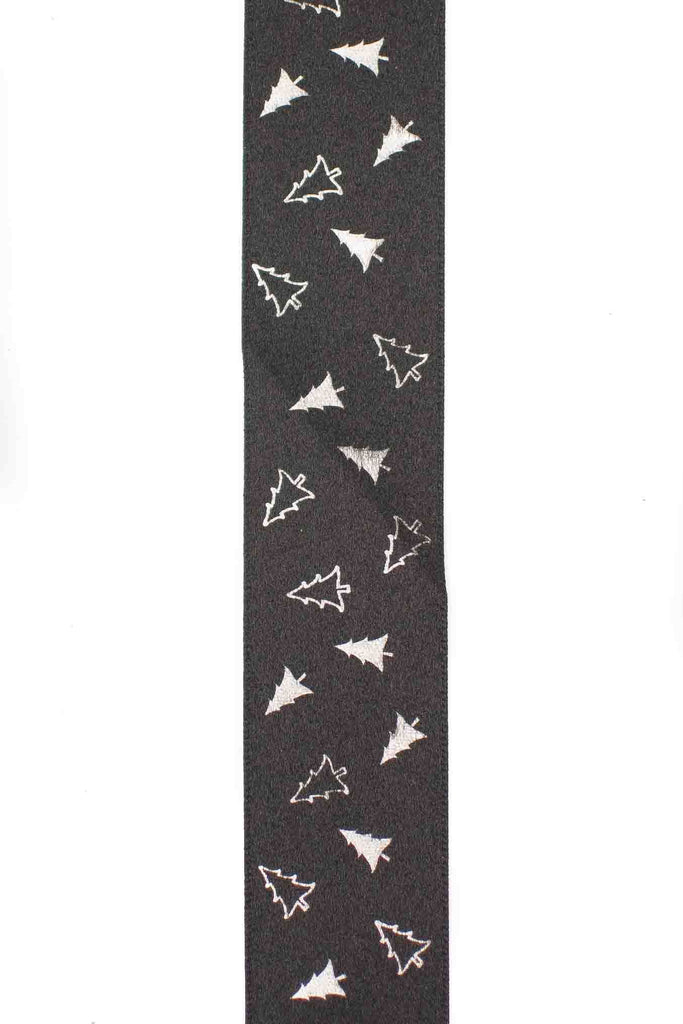 Black Ribbon with a Scattered Silver Christmas Tree Design - 25mm