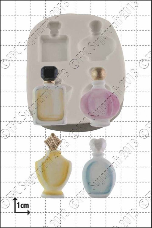 Hand sculpted, four different styles of perfume bottle. The picture shows the mould itself, together with a coloured sugarpaste example of what can be produced. Impressions are shown for illustration only and are not included in the sale. An indication of the mould size and sugarcraft impression is given in the image above. The background grid shows squares 1cm x 1cm (approximately 0.4 x 0.4 inches).