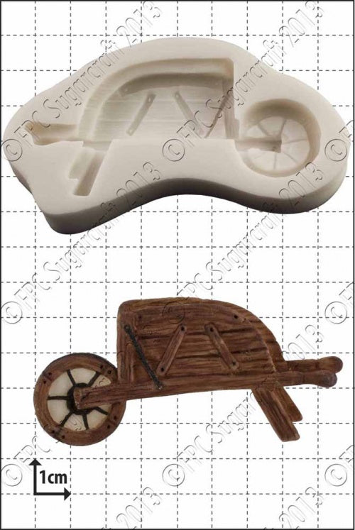 Hand sculpted wooden wheelbarrow. The picture shows the mould itself, together with a coloured sugarpaste example of what can be produced. Impressions are shown for illustration only and are not included in the sale. An indication of the mould size and sugarcraft impression is given in the image above. The background grid shows squares 1cm x 1cm (approximately 0.4 x 0.4 inches).