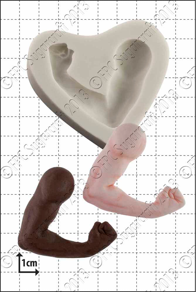 Hand sculpted bulging bicep mould, perfect for weightlifters! The picture shows the mould itself, together with a coloured sugarpaste example of what can be produced. Impressions are shown for illustration only and are not included in the sale. An indication of the mould size and sugarcraft impression is given in the image above. The background grid shows squares 1cm x 1cm (approximately 0.4 x 0.4 inches).