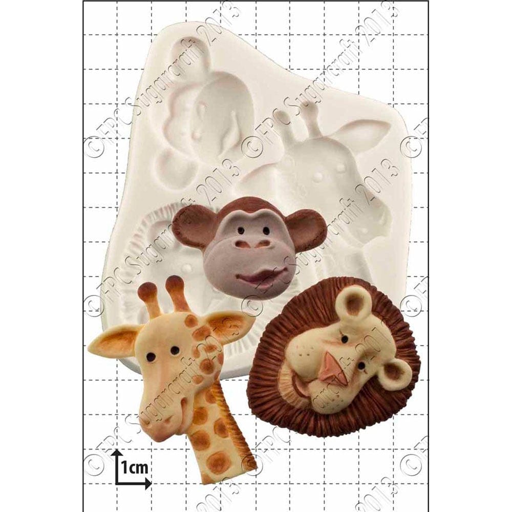 Hand sculpted Lion, Giraffe and Monkey, great for kids cakes. The picture shows the mould itself, together with a coloured sugarpaste example of what can be produced. Impressions are shown for illustration only and are not included in the sale. An indication of the mould size and sugarcraft impression is given in the image above. The background grid shows squares 1cm x 1cm (approximately 0.4 x 0.4 inches).
