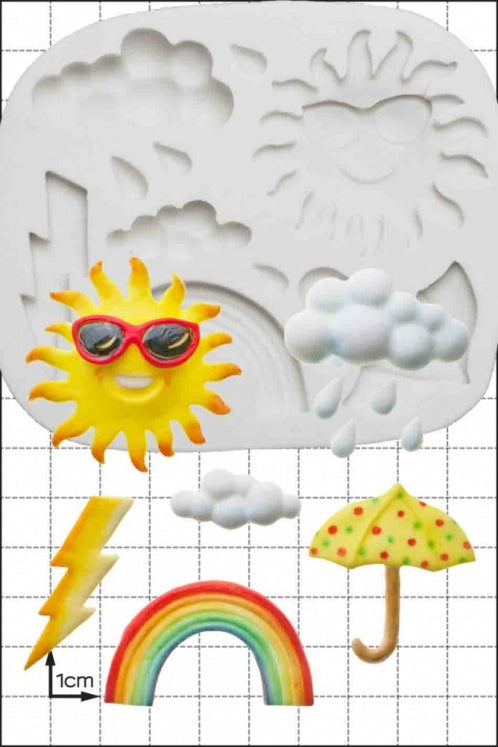 Hand sculpted Weather Mould from FPC. The picture shows the mould itself, together with a coloured sugarpaste example of what can be produced. Impressions are shown for illustration only and are not included in the sale. An indication of the mould size and sugarcraft impression is given in the image above. The background grid shows squares 1cm x 1cm (approximately 0.4 x 0.4 inches).