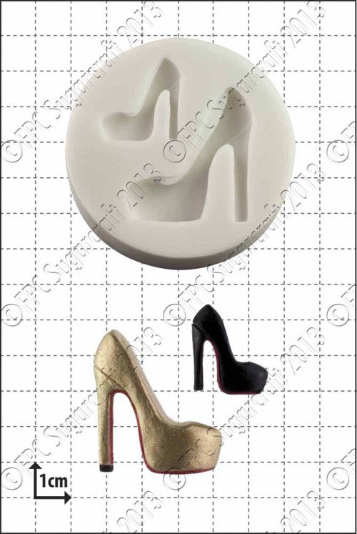 Hand sculpted ladies' high heeled fashion shoe in two different sizes. The picture shows the mould itself, together with a coloured sugarpaste example of what can be produced. Impressions are shown for illustration only and are not included in the sale. An indication of the mould size and sugarcraft impression is given in the image above. The background grid shows squares 1cm x 1cm (approximately 0.4 x 0.4 inches).