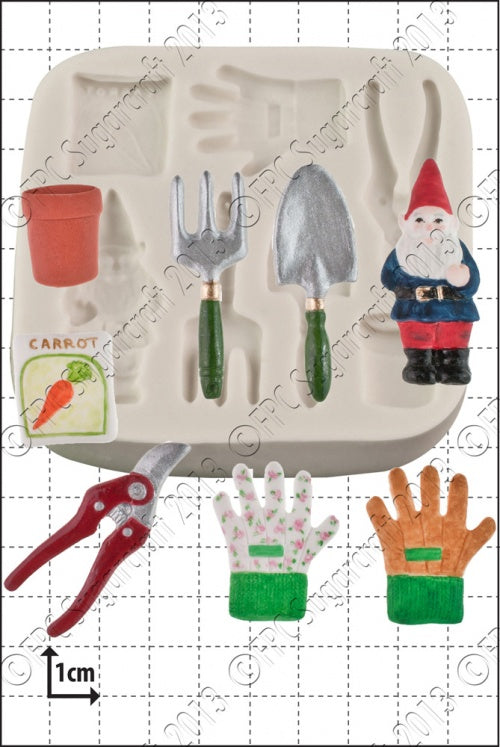 Trowel, Fork, Secateurs, Glove, plant pot, seed packet and a gnome. The picture shows the mould itself, together with a coloured sugarpaste example of what can be produced. Impressions are shown for illustration only and are not included in the sale. An indication of the mould size and sugarcraft impression is given in the image above. The background grid shows squares 1cm x 1cm (approximately 0.4 x 0.4 inches).