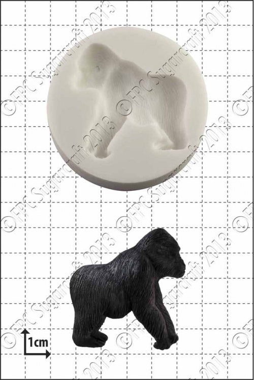 Hand sculpted gorilla mould. The picture shows the mould itself, together with a coloured sugarpaste example of what can be produced. Impressions are shown for illustration only and are not included in the sale. An indication of the mould size and sugarcraft impression is given in the image above. The background grid shows squares 1cm x 1cm (approximately 0.4 x 0.4 inches).