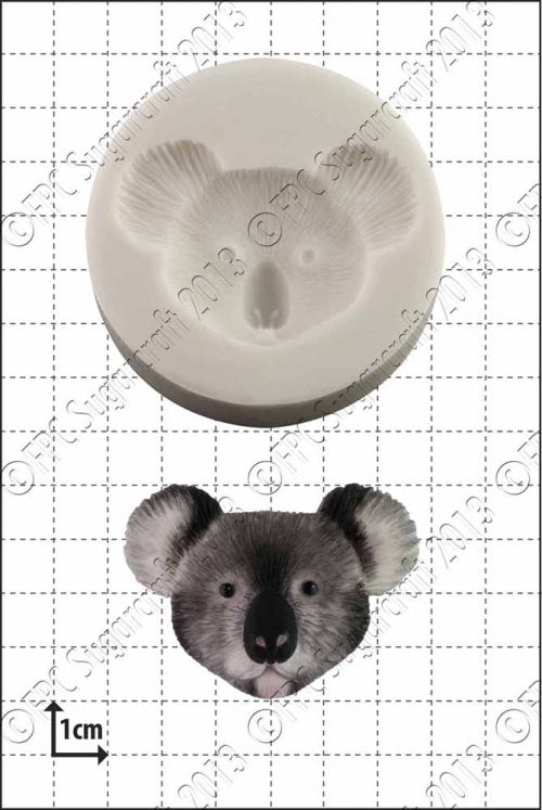 Hand sculpted Koala head. The picture shows the mould itself, together with a coloured sugarpaste example of what can be produced. Impressions are shown for illustration only and are not included in the sale. An indication of the mould size and sugarcraft impression is given in the image above. The background grid shows squares 1cm x 1cm (approximately 0.4 x 0.4 inches).