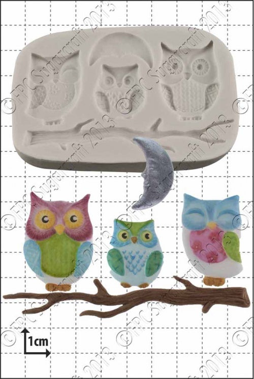 Hand sculpted mummy, daddy and baby patchwork owls, with branch and crescent moon. The picture shows the mould itself, together with a coloured sugarpaste example of what can be produced. Impressions are shown for illustration only and are not included in the sale. An indication of the mould size and sugarcraft impression is given in the image above. The background grid shows squares 1cm x 1cm (approximately 0.4 x 0.4 inches).