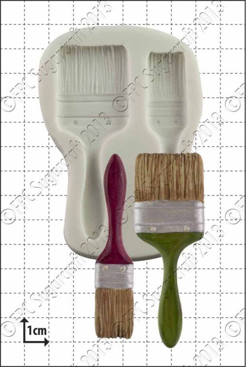 Two hand sculpted paint brushes.. The picture shows the mould itself, together with a coloured sugarpaste example of what can be produced. Impressions are shown for illustration only and are not included in the sale. An indication of the mould size and sugarcraft impression is given in the image above. The background grid shows squares 1cm x 1cm (approximately 0.4 x 0.4 inches).