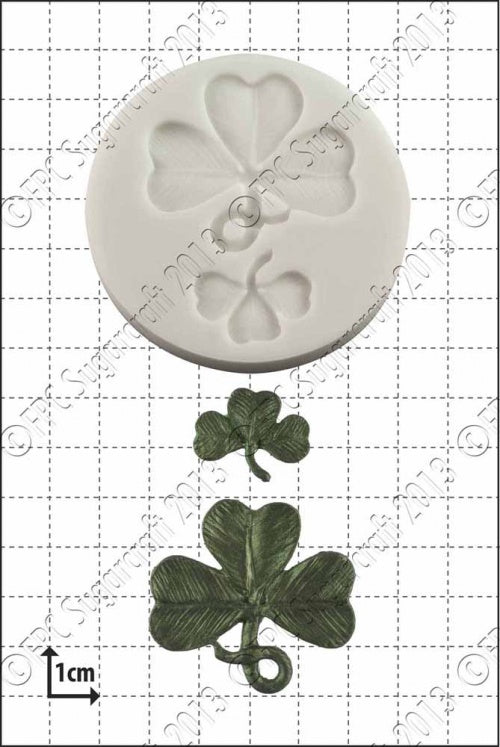 Hand sculpted Shamrock mould. The picture shows the mould itself, together with a coloured sugarpaste example of what can be produced. Impressions are shown for illustration only and are not included in the sale. An indication of the mould size and sugarcraft impression is given in the image above. The background grid shows squares 1cm x 1cm (approximately 0.4 x 0.4 inches).