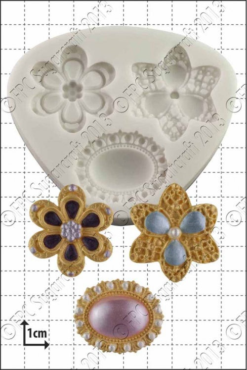 hree decorative brooches mould from FPC. The picture shows the mould itself, together with a coloured sugarpaste example of what can be produced. Impressions are shown for illustration only and are not included in the sale. An indication of the mould size and sugarcraft impression is given in the image above. The background grid shows squares 1cm x 1cm (approximately 0.4 x 0.4 inches).