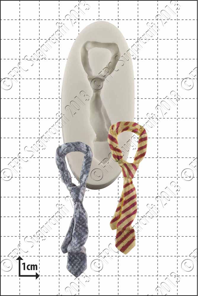 Hand sculpted Tie Mould from FPC. The picture shows the mould itself, together with a coloured sugarpaste example of what can be produced. Impressions are shown for illustration only and are not included in the sale. An indication of the mould size and sugarcraft impression is given in the image above. The background grid shows squares 1cm x 1cm (approximately 0.4 x 0.4 inches).