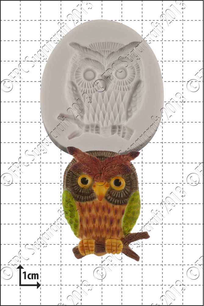 Hand sculpted Wise Owl Mould from FPC. The picture shows the mould itself, together with a coloured sugarpaste example of what can be produced. Impressions are shown for illustration only and are not included in the sale. An indication of the mould size and sugarcraft impression is given in the image above. The background grid shows squares 1cm x 1cm (approximately 0.4 x 0.4 inches).