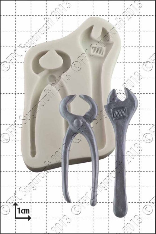 Adjustable wrench and pair of pincers. The picture shows the mould itself, together with a coloured sugarpaste example of what can be produced. Impressions are shown for illustration only and are not included in the sale. An indication of the mould size and sugarcraft impression is given in the image above. The background grid shows squares 1cm x 1cm (approximately 0.4 x 0.4 inches).