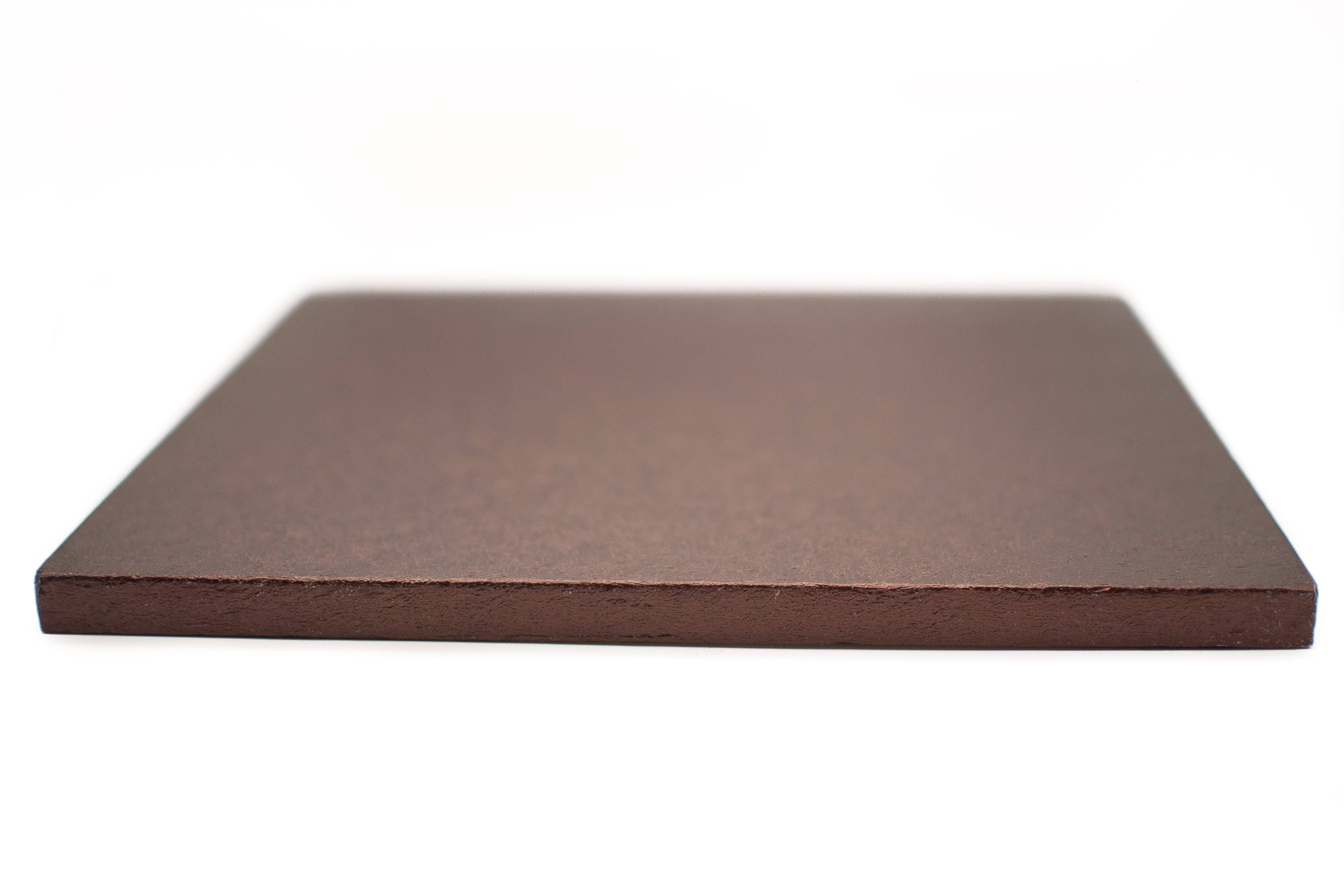 Cake Drums are the strongest type of Cake Board. It has a bonded fibre board inner which is covered on the top and sides with a fern textured, silver coloured foil and with white paper on the base. The finished Cake Board is 0.5'' (13mm) thick.