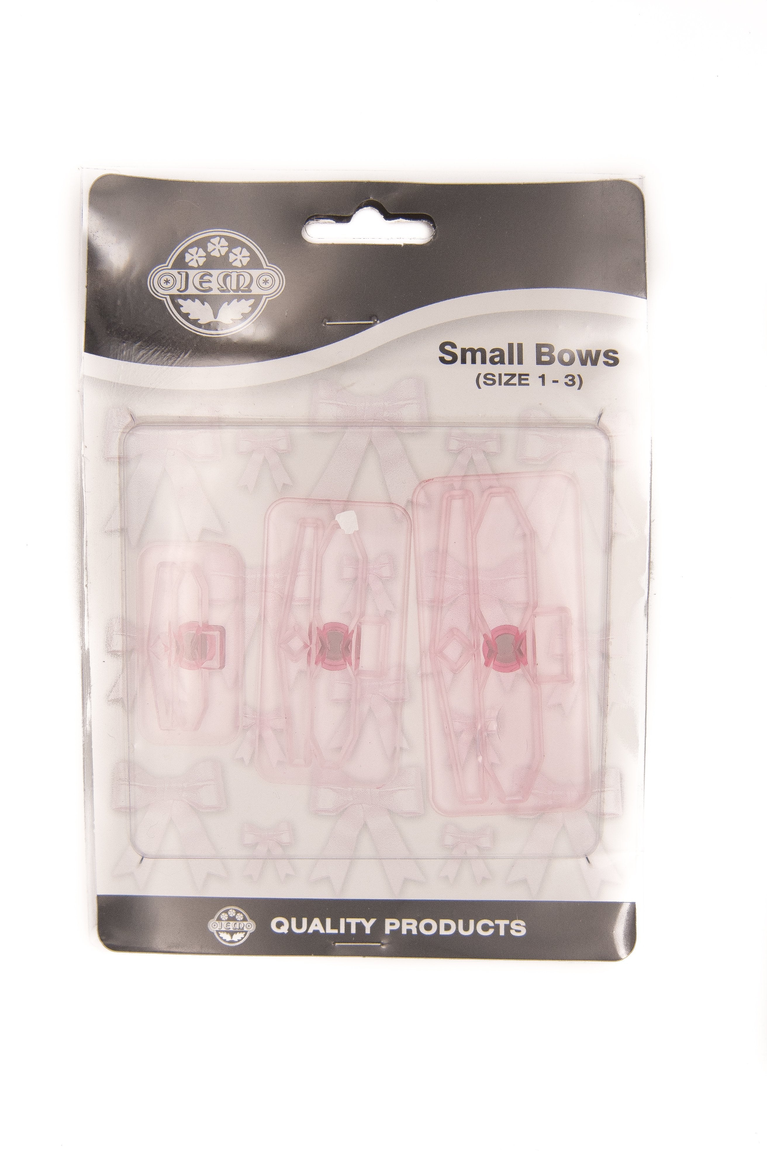 These smaller sized cutters are perfect for adding beautiful bows to cupcakes. Small Bow: 40mm x 18mm Medium Box: 60mm x 26mm Large Bow: 78mm x 35mm