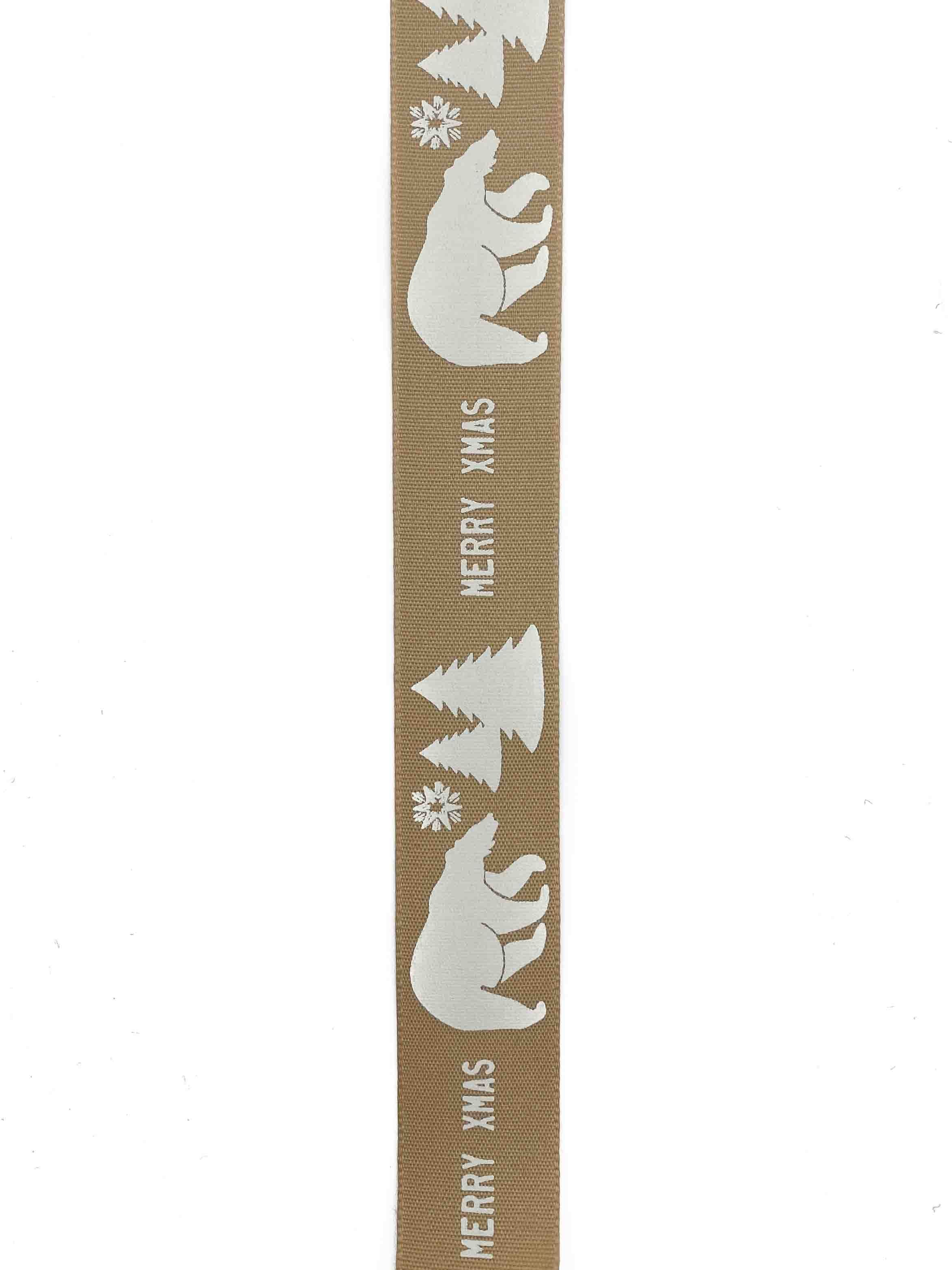 A wintery scene of snowy bears with a message of Merry Xmas on a rustic taffeta ribbon.